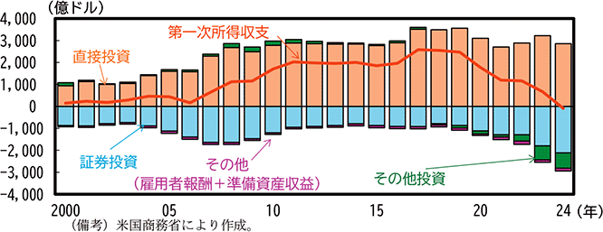 投資収益は、直接投資収益、証券投資収益、その他投資収益、準備資産収益に分けられる85。2000年代後半以降、主に直接投資収益の黒字額が証券投資による赤字額を上回り、第一次所得収支は黒字基調で推移してきた。しかし、2018年以降、直接投資収益が横ばいで推移する一方、証券投資収益とその他投資収益の赤字額が拡大したことにより、第一次所得収支の黒字額は縮小し、2024年には第一次所得収支は1960年の統計開始以降初めて赤字となった。