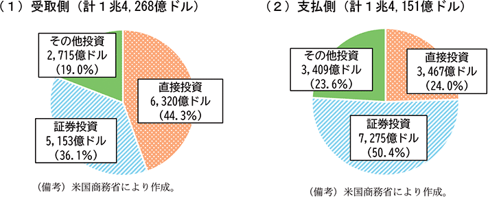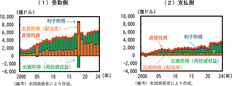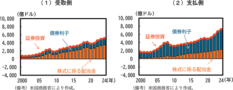 また、第一次所得収支の投資収益について、受取側と支払側に分けて確認すると、2024年時点において、受取の44.3%が直接投資である一方、支払の50.4%を証券投資が占めている(第2-3-7図)。したがって、対米投資(諸外国から米国への投資)と対外投資(米国から諸外国への投資)とで投資形態が異なることが推察される。