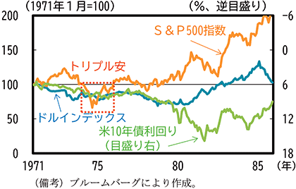 過去、これらの赤字拡大がドルの信認低下を引き起こした例として、1970年代後半から1985年のプラザ合意にかけての動きが挙げられる(図1、図2、図3)。1971年に金本位制が終焉を迎え、各国通貨が変動相場へと移行する中、米ドルを始めとする米資産への信認は低下しつつあった。また、1970年代半ばにかけてベトナム戦争に伴う多額の国防費を支出しており、財政赤字拡大・物価上昇の局面にあった。加えて1970年後半に2度のオイルショックを経験し、消費者物価上昇率は一時前年比14.8%(1980年3月)まで上昇した。その結果、第一次オイルショック後の1973~76年頃には、株式市場が軟調な中でも米ドル、米国債は売られ続けた(トリプル安)。