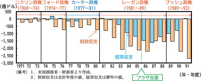 1981年に共和党のレーガン大統領が就任すると、大規模減税と国防費の増加により財政赤字は更に拡大し、1983年に2,078億ドル(名目GDP比5.9%)となった。インフレも鎮静化されず、ドル高が維持される中で経常赤字は1983~85年にかけて一層増加することとなった。この頃から米国の「双子の赤字」が米国のみならず世界経済の大きなテーマとして議論を呼び、基軸通貨ドルの持続性などグローバル不均衡がもたらす影響についての懸念も高まっていった。